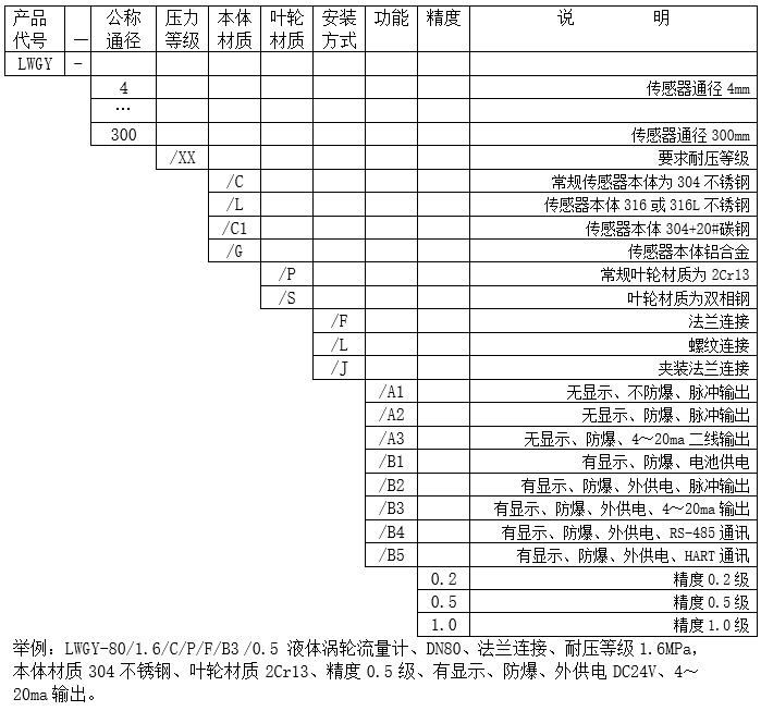 LWGY型液體渦輪流量計(jì)是一種速度式流量測(cè)量?jī)x表。用于測(cè)量充滿于封閉管道中連續(xù)流過(guò)、較低粘度的清潔液體體積流量。流量計(jì)可輸出對(duì)應(yīng)通過(guò)流量計(jì)的體積瞬時(shí)流量、累計(jì)流量的電信號(hào),供自動(dòng)化系統(tǒng)使用。