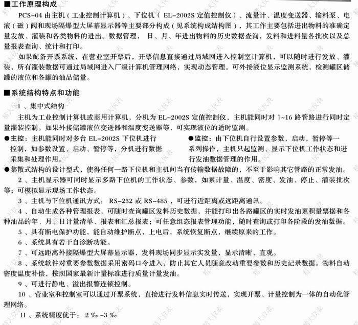 PCS-04微機(jī)定量灌裝控制管理系統(tǒng)是一種集多路流量定量灌裝、多管道流量及罐區(qū)液位監(jiān)控管理為一體的新型控制管理系統(tǒng)。該系統(tǒng)以高性能工業(yè)汁算機(jī)為主機(jī),以EL-2002S定值控制儀為下位機(jī)組成的一種集中式計(jì)量控制管理系統(tǒng)。該系統(tǒng)運(yùn)行于WINDOWS XP或WINDWS 2000操作平臺(tái)上,可實(shí)現(xiàn)石油、油脂及化工產(chǎn)品等物料的自動(dòng)定量發(fā)放、定量灌裝、儲(chǔ)罐液位測(cè)量和液位越限報(bào)警、 儲(chǔ)量的計(jì) 算等功能,并可實(shí)現(xiàn)所有發(fā)料歷史數(shù)據(jù)的記錄、查詢、統(tǒng)計(jì)和打印等。